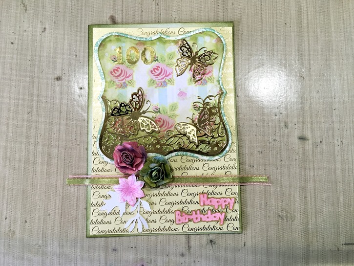 In February I went to the Craft4Crafters craft show in Exeter, and bought some lovely dies by Die’sire (Crafters’ Companion) – these are supposed to be to create easel cards but I thought this lady might not know how to work them, so I decided on doing a straightforward card for her, using most of the elements. I chose the gorgeous butterfly card set.